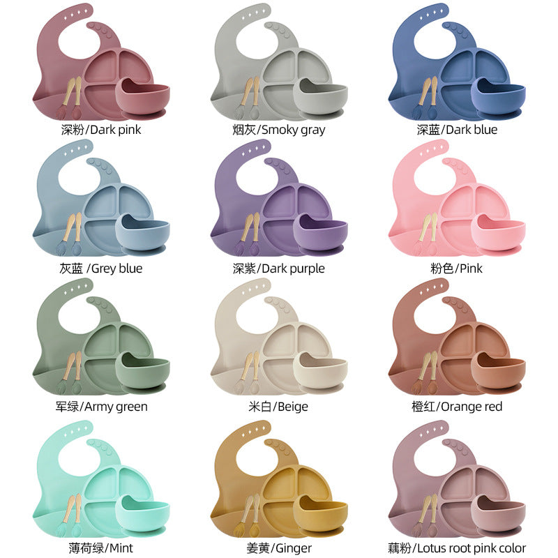 The set includes a soft silicone bib with a deep food catcher, a divided plate for balanced meals, a gentle silicone bowl, and training spoon & fork with wooden handles that are easy for little hands to grip. Each piece is thoughtfully designed to support baby-led weaning (BLW), reduce mess, and encourage independence at every stage of feeding.